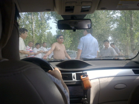 到達(dá)灘區(qū)的一條公路上時(shí),兩名騎摩托的男子追趕上來,將摩托車橫在了采訪車前,并沖過去要求記者們下車, “你們是不是想找死啊……”