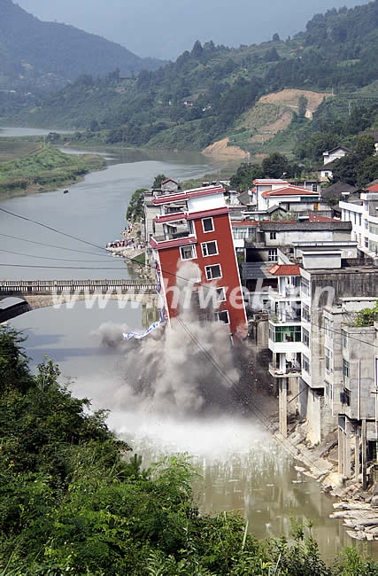 在限期內(nèi),房主仍未自行拆除。7月24日,縣防汛抗旱指揮部委托湖北宜昌一家爆破公司承擔(dān)該違法建筑的爆破拆除任務(wù)。