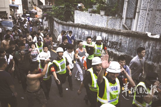昨日下午2時,羊城晚報記者接到報料迅速趕往現(xiàn)場見到,圍觀的人群布滿在各個警戒線的周圍,現(xiàn)場停了十幾輛警車和消防車,數(shù)十名警察和消防人員聚集在樓下商量對策。