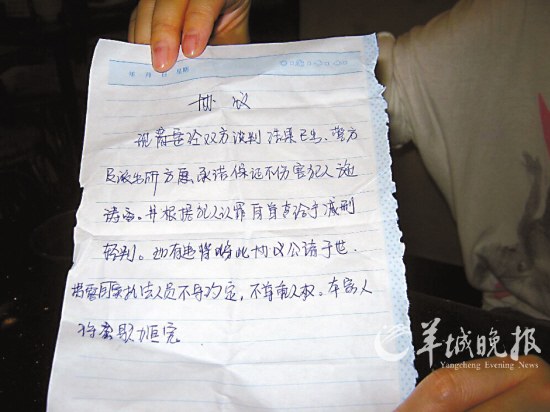 過了半個小時之后,施某提出要吃東西。“他已經(jīng)三天沒有吃東西,三天來他從沒下過樓,想起來我就心疼。”于是施麗佳下樓買了兩個盒飯帶上去了!霸谶@段時間,我勸他:警察殺你很簡單,為什么不投案自首呢?如果自首他們會保證你的安全,如果你不放心,我們可以和他們簽一份協(xié)議。”施麗佳向記者出示當時協(xié)議的草稿,據(jù)施麗佳稱,協(xié)議的主要內(nèi)容為施某投案自首,警察保證他的安全,并根據(jù)自守的情節(jié)向法院求情。