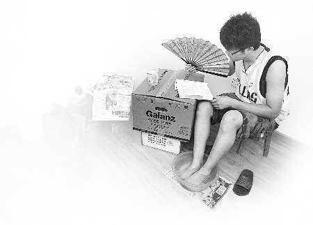 小韓說,自己與同學發(fā)明了一套“泡腳”消暑法,每當晚上酷熱難當時,便每人接上滿滿一桶涼水,把雙腿完全泡在其中,泡腳的同時還可以看書、上網(wǎng),感覺非常涼爽。