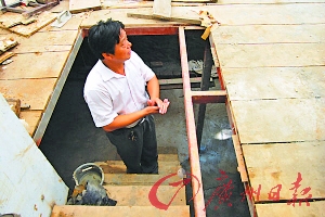這個(gè)“地宮”位于南京市五塘廣場(chǎng)附近的白云新寓小區(qū)內(nèi),業(yè)主許先生,今年40多歲,安徽人。2009年,他在該小區(qū)買了一套面積為42平方米的房子,這套住宅南面與房屋相連有個(gè)院子,差不多有30平方米大。從圖片可以看到,院子被一層齊地的木板隔成地上和地下兩層,由樓梯相互連接。