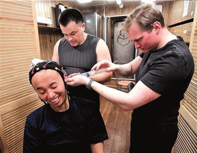 王躍(左一)在模擬艙內(nèi)進(jìn)行腦電極試驗(yàn)。俄羅斯生物醫(yī)學(xué)問題研究所供圖
