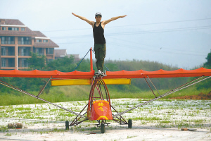 锃亮的不銹鋼骨架、紅色帆布纏綁成的機翼,只能容一人坐。曾強說,他在浙江訂制了一臺發(fā)動機(由250毫升排量的摩托車發(fā)動機經(jīng)過改裝,功率提高了2倍),發(fā)動機還沒有運到,一旦裝上就將真正“騰飛”起來。