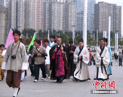 白楊是這群人里為數不多的女性。她告訴記者,自己一直就很迷戀中國古代的服飾,這次穿的衣服是在網上訂做的,總共花費不足二百元,現在能有機會穿出來,真的很高興。今天在路上,還有人問白楊是不是韓國人,“呵呵,以后每逢傳統節(jié)日都會這樣穿著,我要讓大家知道這叫漢服!”