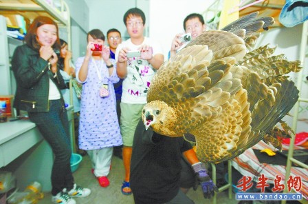 9月28日傍晚 6時許 ,青島大學(xué)美術(shù)學(xué)院的女生小劉下課后回到宿舍,剛走進(jìn)宿舍門,一只鷹從陽臺飛進(jìn)屋內(nèi)朝她撲來,嚇得她失聲尖叫沖到門外。這只鷹在屋內(nèi)東闖西撞,墻壁上留下了斑斑血跡,隨后趕來的男生將它抓住。29日下午,青島市動物園動物管理科的專家來到宿舍將受傷的鷹帶走,經(jīng)鑒定這只鷹是國家二級保護(hù)動物——蒼鷹,工作人員將會在其傷情痊愈后擇日放生。