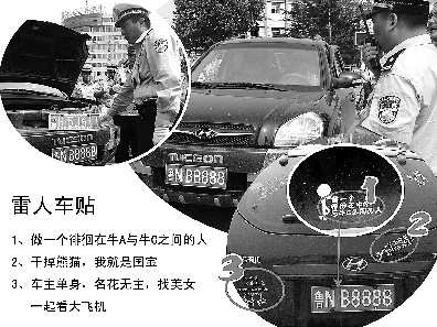 更讓民警哭笑不得的是,該車車身還貼滿了諸如“干掉熊貓我就是國寶”、“做—個徘徊在牛A和牛C之間的人”、“車主單身,名花無主,找美女—起看大飛機(jī)”等雷人標(biāo)語。(記者黃廣華通訊員侯明輝)