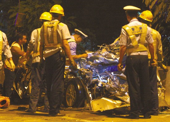 羊城晚報記者昨晚9時許來到北二環(huán)高速米龍大橋路段,只見東往西方向車道上,停滿了救援車輛,大批交警、消防員和救援人員在緊張工作中。記者看到,在出事的米龍大橋路肩上,停著兩輛大貨車、一輛黑色小轎車和一輛綠色面包車。大約在9時30分,救援人員從已被撞成廢鐵的黑色小轎車中救出一名男子和一名女子,兩人看上去均年約20多歲?上В(jīng)現(xiàn)場救護(hù)人員診斷,兩人已當(dāng)場死亡。