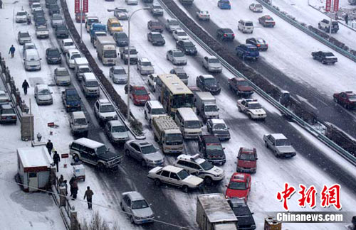 由于大雪的緣故,烏魯木齊街道部分路段交通擁擠,車輛排起長(zhǎng)隊(duì)。記者在烏魯木齊東外環(huán)路金銀大道段看到,百余輛車在此停滯排隊(duì),綿延數(shù)公里。