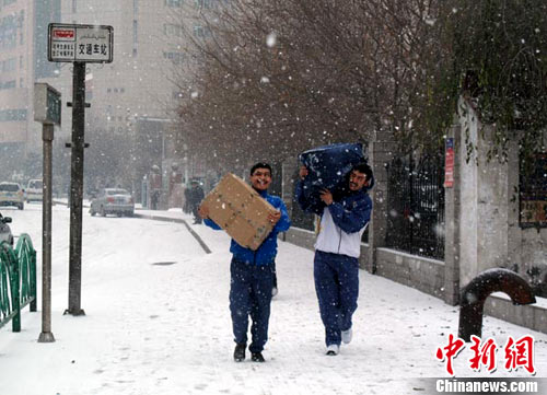 記者在烏魯木齊街頭看到,道路上的行走較往日減少,因?yàn)樘炖渎坊,市民大多都擠上了公交車,還有人焦急地等待出租車。到中午11點(diǎn)時(shí),雪花開始變大,記者到外面拍照采訪,來回不到二十分鐘的時(shí)間里,記者身上落滿了一層雪花。