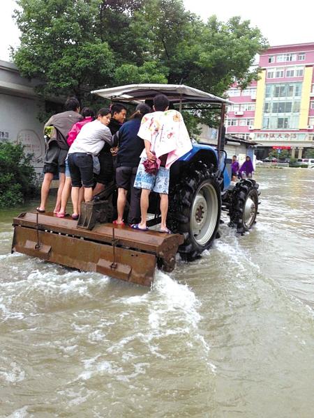 臺(tái)風(fēng)“菲特”帶來的強(qiáng)降雨致使道路成了洼地,過路成了“過河”,給人們出行帶來極大的不便。昨天,鄞州橫溪鎮(zhèn)的小伙子張超,特地開著自家耕田用的拖拉機(jī),來回載著村民們進(jìn)出村里。