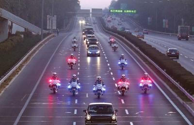國賓護衛(wèi)隊員護衛(wèi)著國賓行進在機場高速路上。京華時報特約記者李光印攝
