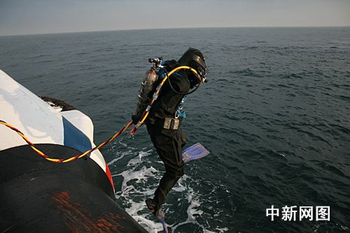 中國潛水員在圣文森特籍集裝箱船“金盛”輪與韓國輪“金玫瑰“碰撞沉沒海域,進行大規(guī)模搜救。