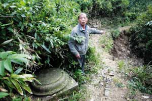“竹子一砍掉后,一個(gè)巨大的房柱石地盤(pán)就露了出來(lái),顏色有些發(fā)青。坍塌的坑里有很多青瓦!