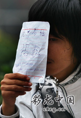 羞澀的表情,略亂的頭發(fā),穿一身白色衣服,旁邊擺一個旅行包。這個臉上還有著稚氣的小伙子,用蹩腳的普通話指著紙上的字,有些不好意思地說:“寫得很不好!笔峙e一張紙遮住臉,上面是他自己用鋼筆寫的“此廣告位出租”6個大字,右下角留的小字標有自己的QQ號和電子郵址。