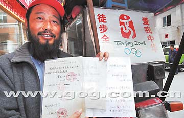 10月21日下午,“徒步中國,宣傳奧運”的湖北宜都人李春華在貴陽河濱公園,向記者展示國家奧組委和他所到地區(qū)政府給他的題詞以及加蓋的公章。今年45歲的李春華,2000年12月26日從云南西雙版納開始實施自己多年的夢想,徒步全國,宣傳奧運。七年間,李春華歷經(jīng)風(fēng)雨和苦難,足跡遍及大半個中國,預(yù)計23日從貴陽離開前往云南,走完這一行的最后一段。