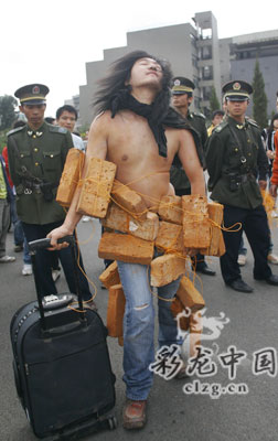 又是他!繼今年5月1日在南屏步行街以全身貼滿人民幣的形式進(jìn)行了一場名為“金錢加權(quán)力等于一切嗎”的行為藝術(shù)后,云南藝術(shù)學(xué)院03級油畫班畢業(yè)生王軍昨天背負(fù)磚頭行走兩個(gè)多小時(shí),用他覺得最棒的方式說一聲:“昆明,我走了!