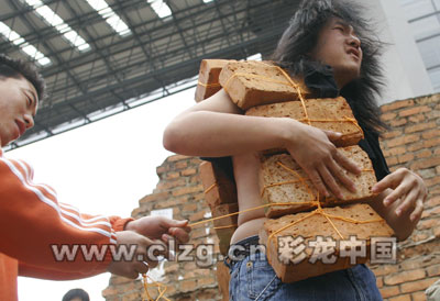 見已經(jīng)無法前進(jìn),王軍沮喪地和朋友抱在一起,取消了穿過校園的計(jì)劃。由于有些不堪重負(fù),再次出發(fā)后,他僅在脖子上掛上一塊磚。