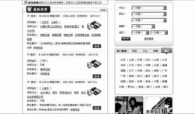 “現(xiàn)有503人成功發(fā)布懸賞,已有291人正在職客的指導(dǎo)下找工作!贝蜷_一家域名為http:///的職客網(wǎng),不斷更新的數(shù)字赫然入目。眾多職客網(wǎng)上,求職“懸賞令”通常被當(dāng)作“招牌”掛在網(wǎng)站的首頁。