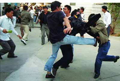 5分鐘后,校方員工再次出動(dòng),有的人手上還拿著兩根一米長(zhǎng)的鐵棍,而工人們順勢(shì)從門口的竹籬笆處拔下七八根碗口粗的毛竹對(duì)鐵棍,雙方開始一場(chǎng)混戰(zhàn),“啪、啪”聲不絕于耳。兩三分鐘后,毛竹被打爛,就在工人高喊著找磚頭時(shí),警方趕到。一名警察一邊高喊“不許打架”,一邊拿著手中的辣椒噴霧器對(duì)著打斗雙方噴射……