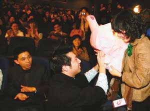現(xiàn)場(chǎng)的朋友們見(jiàn)證我們的愛(ài)情,你愿意嫁給我嗎?”3分鐘短片結(jié)束,放映廳也恢復(fù)了光明。人們看到,觀眾席里有個(gè)小伙子正跪在一個(gè)女孩面前,手捧玫瑰、鉆戒,緊張地等待著女孩的答復(fù)。“我愿意,我愿意……”女孩連連點(diǎn)頭,泣不成聲。雷鳴般的掌聲里,這場(chǎng)浪漫求婚秀的主角、濟(jì)南某公司銷(xiāo)售經(jīng)理謝剛,一把攬過(guò)女友孫靜,陶醉在一片幸福的海洋里。