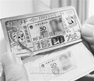 在先鋒路小學(xué)附近,一家“綿陽市教輔材料指定銷售點”的商店里,不少學(xué)生聚在一起買彩票,地上丟滿了被揉爛的廢棄彩票。其中一個孩子沒摳到獎,又拿出5毛錢繼續(xù)買彩票。記者看到,這種彩票正面是彩色的50元鈔票圖案,印有“中國兒童銀行”字樣,背面寫著游戲規(guī)則:“揭開獎單,每盒必中”。中了5角、1元、2元、5元、10元獎金由小賣部支付。揭開后,里面是20元鈔票圖案,上面是“謝謝惠顧”或中獎金額。