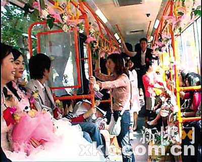 “一開始打算用寶馬當(dāng)花車,但如果只租三四輛寶馬就不夠氣勢了,租七八輛又太貴,所以最后決定用一部超長的車來當(dāng)花車,這樣既有氣勢又可省錢!辟囅壬嬖V記者,他把地面上能用的交通工具都想了個遍,后來經(jīng)過自家門口的同德圍車站時,突然發(fā)現(xiàn)215路公交車既長又寬,完全符合他的設(shè)想,因此定下來由它做花車!斑@樣我和新娘,還有一幫朋友都可以聚在車?yán)锿,好像舉辦一個結(jié)婚PAR-TY,很過癮!辟囅壬f。