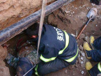 接到報警的張家口市公安消防支隊橋東大隊特勤中隊的官兵迅速趕到現(xiàn)場。從目擊者處了解的情況是,塌方時有5名施工人員正在一坑道內(nèi)進行挖掘作業(yè),全部被埋在下面。其中三人被埋的深度較淺,兩人較深,土層厚度約有兩米。