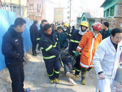 然后,消防隊員馬上對現(xiàn)場的土層和混凝土塊進行清理。當發(fā)現(xiàn)被埋較深的兩名工人后,經(jīng)檢查,一人已經(jīng)死亡,另一人仍有生還希望!