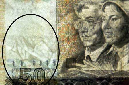 后經(jīng)記者仔細(xì)辨認(rèn),發(fā)現(xiàn)這張編號(hào)為GS8790902的1990年版的50元人民幣和其他同版本同面值的一樣,正面都是工人、農(nóng)民和知識(shí)分子頭像,背面是黃河的壺口瀑布,不同的是正面毛主席像水印頭像卻呈倒立狀,并且位置比正常錢幣偏上。這張錢幣的水印和正常錢幣的差異如此之大,難道是張假幣?可是朱燦祥卻告訴記者,他的這張鈔票無論在哪家銀行驗(yàn)鈔,都會(huì)出現(xiàn)同一個(gè)結(jié)果:是張真幣。