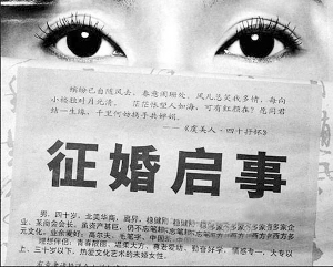 版式古樸儒雅,令而耳目一新,啟事中的個(gè)人介紹,又令人怦然心動(dòng)。不足百字的介紹中,涵蓋了許多人終身都無(wú)法達(dá)到的夢(mèng)想。男、40歲,北美華商、善良儒雅、擁有多家企業(yè)、某商會(huì)會(huì)長(zhǎng)、多部著作面世,一首自創(chuàng)的《虞美人·四十抒懷》,更是將一名儒商形態(tài)表露無(wú)余。