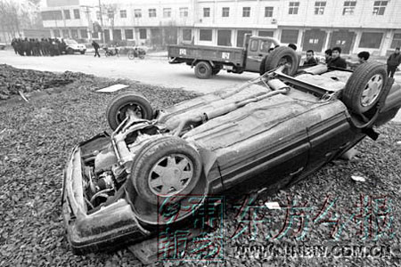 民警在國道上查車,追趕一輛轎車1000多米后,把轎車擠翻。司機(jī)在車?yán)锖熬让,民警卻不管不問,直接離開。上百名群眾氣憤不已,堵截肇事警車。