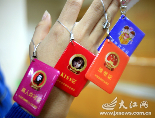 證件,人們?nèi)粘I钪凶钇匠R沧畈豢苫蛉钡挠闷,如今被網(wǎng)絡(luò)惡搞之風(fēng)席卷:“戀愛證”、“帥哥證”、“結(jié)婚證”、“處女證”等令人啼笑皆非的“惡搞證件”層出不窮。很多學(xué)生將它們掛在手機(jī)、鑰匙或背包上,將之視為一種新的校園時(shí)尚元素。記者發(fā)現(xiàn),被惡搞的紅色“結(jié)婚證”與真正的結(jié)婚證很相似,內(nèi)頁可以填寫兩個(gè)人的姓名,只是封面上印著“中國婚姻聯(lián)盟頒發(fā)”字樣。在“光棍證”、“流氓證”等證件中,同樣有大量的惡搞內(nèi)容,有些十分低俗。懷揣著“流氓證”的南昌市某小學(xué)三年級學(xué)生萬兵(化名)稚氣未脫地對記者說:“我是流氓我怕誰,拿著它多帥!”