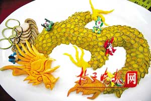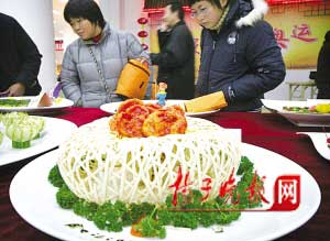 走進(jìn)展廳,記者就被展臺(tái)上的菜肴所吸引。在比“雕工”的展區(qū),南瓜、蘿卜、山芋等普通蔬菜被廚師們用妙手雕刻成龍、鳳、仙子等各色造型,刻工精細(xì),龍須、鳳尾上的羽毛,甚至是一根根的。已有10年廚齡的宋師傅告訴記者,作品里除了南瓜、還有紅、青蘿卜、山芋等食材,一共刻了三個(gè)小時(shí)才完工。在比“擺盤”的展區(qū),不少菜肴都是以奧運(yùn)為主題,用面條搭建的“鳥巢”體育場,形象逼真。用白色白玉糕、綠色麥香糕、糯米元宵擺出的五環(huán)體育場惟妙惟肖,“操場”外五位用糯米做的福娃更是可愛喜人,據(jù)介紹,從蒸糕點(diǎn)到擺盤,廚師一共花了九小時(shí)呢,香噴噴的米糕看著都眼饞。