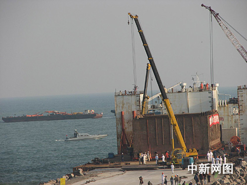 據(jù)介紹,今天適逢一個月內潮位最高之日,本最有利于“南海一號”登陸。經過今晚約兩個小時的努力,“南海一號”在甲板上被拖移了約十六米,但離碼頭尚有約八米。