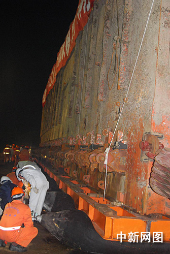 “南海一號”原本計劃今晚拖至岸上,并拉移至“水晶宮”中。在現(xiàn)場,記者看到,工作人員利用16個氣囊墊在“南海一號”下進行拖移。每個氣囊直徑一米,能承受五百噸的壓力。在拖移過程中,工作人員必須不斷調整氣囊位置,但顯然難度不小。在工作進行到十點半左右時,有關方面決定暫停拖移。