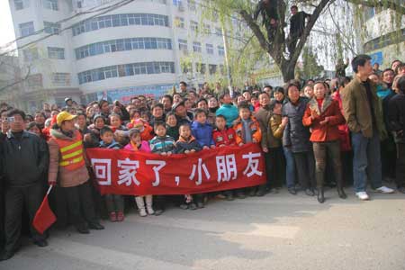 11時,一個由近20輛車組成的車隊從賓館出發(fā)到高速路口迎接孩子?吹杰囮牫鰜,人群讓出通道。擠在人群最前面的是淅川縣的部分小學(xué)生。他們舉著小旗、拍起巴掌,拉起條幅“小朋友,歡迎你們回家”。