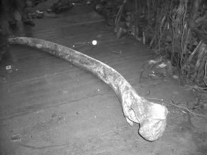 據(jù)煙臺(tái)晚報(bào)報(bào)道,2007年10月一個(gè)海陽(yáng)市民,在海邊撿到一根奇大的魚(yú)骨,呈灰白色,長(zhǎng)2.3米,厚度約0.15米,重約40公斤。專(zhuān)家初步察驗(yàn)后稱(chēng),這是一根鯨魚(yú)的肋骨(也就是說(shuō)是一根“魚(yú)刺”),從這根肋骨推測(cè),這條鯨魚(yú)“生前”體重至少有幾十噸。