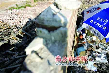 在石龍鎮(zhèn)王屋洲南岸二橋的右側(cè),一圈鐵皮將上萬個(gè)平方的面積圈了出來,其內(nèi)大多是一片殘磚破瓦的廢墟。引人注意的是,在廢墟的正中央有間孤零零的磚房。房子的屋頂已經(jīng)完全塌倒在地,而房子的左右墻壁并沒有被完全推倒。在鐵皮圈的另一側(cè),還有兩間磚房孤獨(dú)地豎立在鐵皮圈內(nèi)。在已被拆除屋頂?shù)姆孔忧,幾張硬紙箱疊在一起,旁邊有一大袋毛衣!拔椰F(xiàn)在每天晚上都住這里”。說這話的是石龍鎮(zhèn)王屋洲62歲的村民鄭光華。