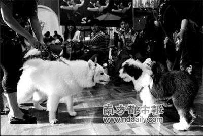 現(xiàn)場一下子要請來幾十名狗狗,真不容易。狗主們各顯神通,有的拿包包當(dāng)工具,有的直接抱進(jìn)來的,訓(xùn)練有素的狗狗則直接跟在主人后面閃亮登場了。它們在現(xiàn)場看到這么多同類,都好奇地互相打量,小心翼翼地上前用鼻子嗅嗅,算是問個安了。
