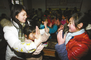 晚6時,東洲春蕾希望小學(xué)。住校的孩子們都已吃過晚飯,但停了一天的電依然沒來。一陣哨子聲響過,同學(xué)們又回到教室。一年級2班,數(shù)學(xué)老師姚川杰正和孩子們做游戲,教大家拍手和跺腳取暖!叭绻械娇鞓纺憔团呐氖!”跟著老師的節(jié)奏,孩子們的巴掌聲響成一片。