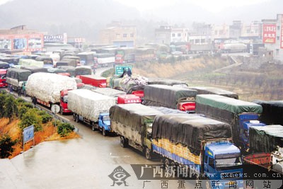 在現(xiàn)場,全州縣公安局副局長兼交警大隊大隊長唐新文正率領數(shù)名交警指揮交通。他告訴記者,衡昆高速公路湖南段因路面結冰,湖南方面為防止出現(xiàn)重大交通事故,封閉了連接廣西的高速公路。近日,與湖南相接通的全黃高速公路路面也結冰,1月22日上午10時起全線封閉。不過,由南往北的大貨車還可以走322國道,經黃沙河鎮(zhèn)進入湖南境內。但由于大貨車比較長,而且載重量大,加上這段路的路況復雜,貨車司機擔心路上不安全,所以都想等到全黃高速路放行后再走,以致滯留的大貨車越來越多。