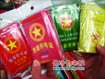 24日下午,記者在黃埔軍校舊址紀(jì)念館大聯(lián)盟商店的一攤紀(jì)念品中,赫然發(fā)現(xiàn)一只紅彤彤的“泡妞許可證”,拿起來方知是只鐵皮煙盒。除此之外,還有以國徽為背景的“中華人民共和國超級(jí)帥哥證明”、“泡哥許可證”、“靚女證書”、“土匪資格證”、“流氓合格證”、“光棍證”、“傻B證”等五花八門的煙盒。