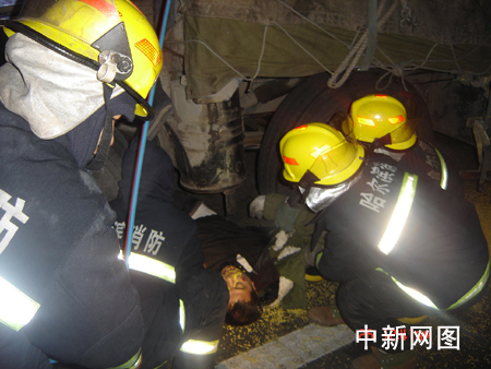 凌時三十分,太陽島消防中隊(duì)的消防戰(zhàn)士接到報警立即趕往現(xiàn)場救援。消防戰(zhàn)士趕到現(xiàn)場時看到,一輛被追尾拉著貨物的大貨車車頭與車廂之間夾了一個人,在車廂左側(cè)底下前輪旁還躺著一名男子已經(jīng)死亡,該男子穿著一件軍大衣被卡在車輪下。消防戰(zhàn)士將駕駛室后面的拉桿鋸掉,用液壓破拆組合工具將車廂與車體支開一定的距離,之后將安全繩系在被困男子的腰部,將被困人員救出,F(xiàn)場可以看到,后面的大貨車已經(jīng)嚴(yán)重變形,駕駛室與前車車廂融為一體,車上的兩人已經(jīng)被送往醫(yī)院。