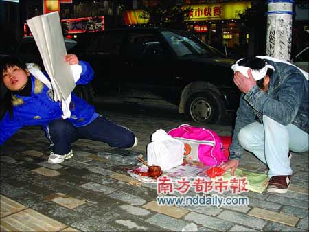 記者趕到時(shí),只見(jiàn)一男一女跪在地上,他們頭上系著白布,旁邊點(diǎn)著蠟燭,放著骨灰盒,燒著紙錢。圍觀的市民被這一場(chǎng)景感動(dòng),紛紛慷慨解囊。記者詢問(wèn)時(shí),女子一直支支吾吾并抽泣。記者拍照時(shí),女子用石塊砸向記者。男子對(duì)記者說(shuō):“這本來(lái)就是騙錢!” (記者 馬小六)