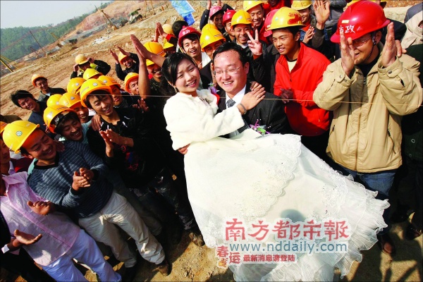 高輝和現(xiàn)在南山外國(guó)語(yǔ)學(xué)校擔(dān)任音樂老師的妻子黃莉琴都是江西人,本來已經(jīng)和家里人說好,今年春節(jié)回家鄉(xiāng)舉行兩人的婚禮,但是自從去年8月開始,高輝所有的節(jié)假日和雙休日都被工地上忙碌的工作占滿了。因?yàn)閷?shí)在抽不出時(shí)間回老家舉辦婚禮,在征得了妻子的理解和同意后,小兩口最后決定在大運(yùn)會(huì)施工現(xiàn)場(chǎng)舉行自己的婚禮。