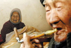 如今,照顧兩人的重擔(dān)落到60余歲的兒媳身上,他們的兒子10余年前就去世了。天冷,兒媳就給他們弄了一盆火放進屋里,老人坐在火盆旁,時而抽一口旱煙,再喝一口茶水,神情安詳。而他的老伴,一直不離被窩。