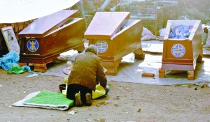 昨日,唐縣倒馬關鄉(xiāng)夾子村柴振國家中,白色塑料布將前后院罩住,院內(nèi)搭起了簡易的靈棚。7口大棺材和2口小棺材擺在門前,9具尸體停放在前后院,陣陣哀哭聲從靈棚中傳出。