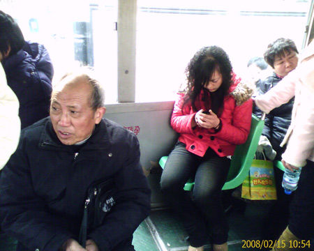 “雖然這樣,但該女子假裝沒(méi)有聽(tīng)見(jiàn),依舊坐在那里發(fā)她的短信,我抱著孩子在其旁邊站了一會(huì),該女子還是依然如故,好在很快有人下車了!本W(wǎng)民“techuen333666”說(shuō),于是,他抱著孩子坐在駕駛員后面的工具箱上,用手機(jī)給那個(gè)搶座的女子拍了照片。