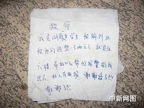 這天下午,一位熱心的中年婦女把發(fā)現(xiàn)字條的情況告訴了正在此地巡邏的民警,并把民警帶到樓下。民警見(jiàn)字條上面寫(xiě)著“救命,我是湖南一女學(xué)生,被騙到此被他們囚禁了兩天了,就在六樓,希望好心人幫忙報(bào)警救我出去,好人有好報(bào)、謝謝您了!。 。